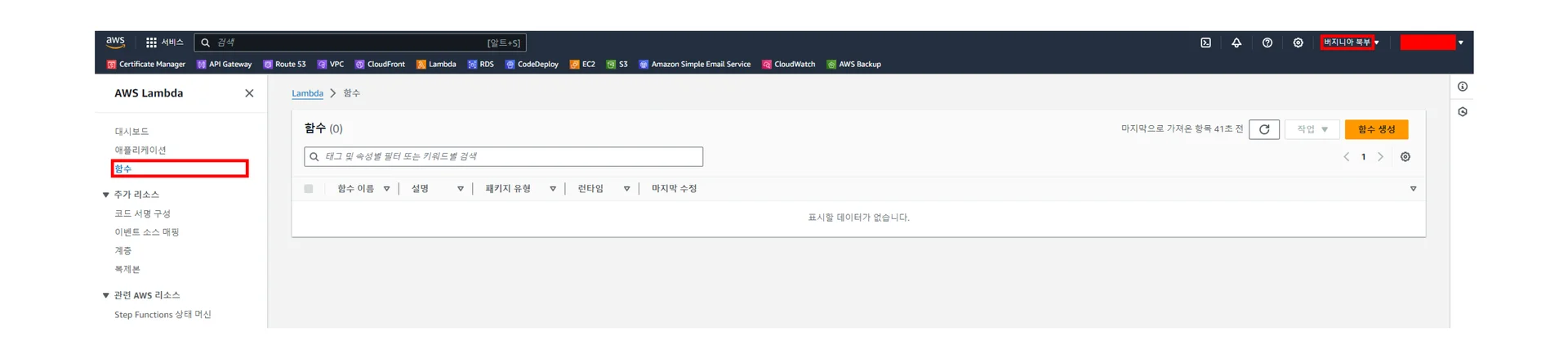 AWS Console에서 Lambda 검색해서 클릭하기