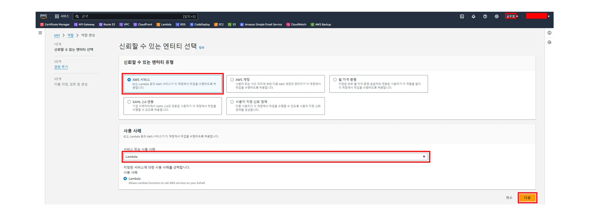 [IAM] - [역할] - [역할 생성] - [1단계, 신뢰할 수 있는 엔티티 선택]에서 주요 설정값을 아래 이미지에 맞춰서 선택해주세요.
