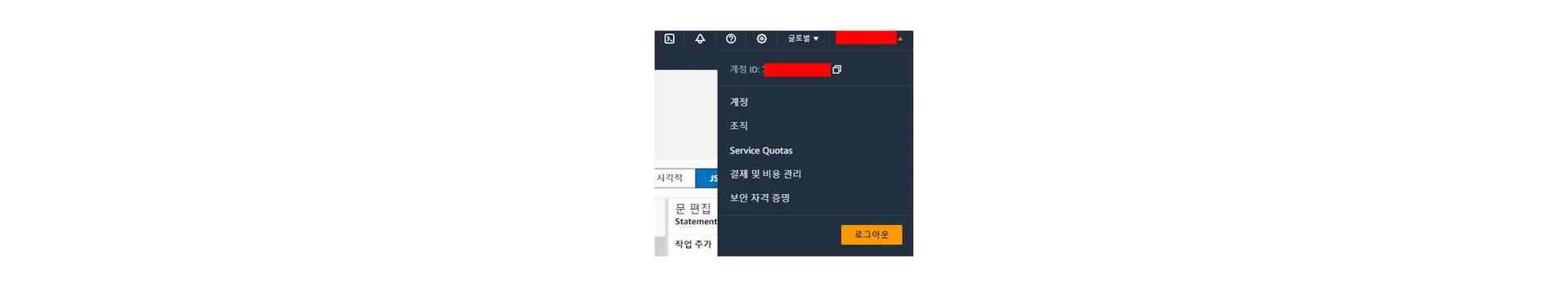 여기서 말하는 <AWS_ACCOUNT_ID>는 우상단의 본인 닉네임을 클릭하면 계정 ID 항목에서 확인할 수 있습니다.
