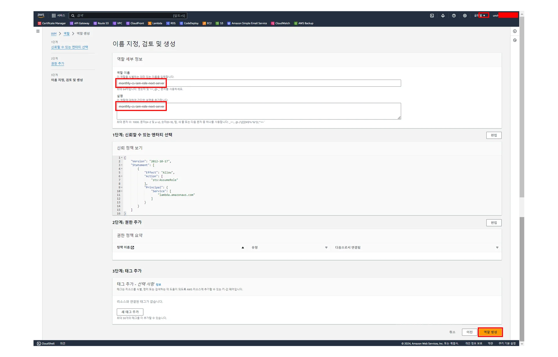 [IAM] - [역할] - [역할 생성] - [3단계, 이름 지정, 검토 및 생성]에서 주요 설정값을 아래 미리보기 이미지에 맞춰서 생성해주세요.