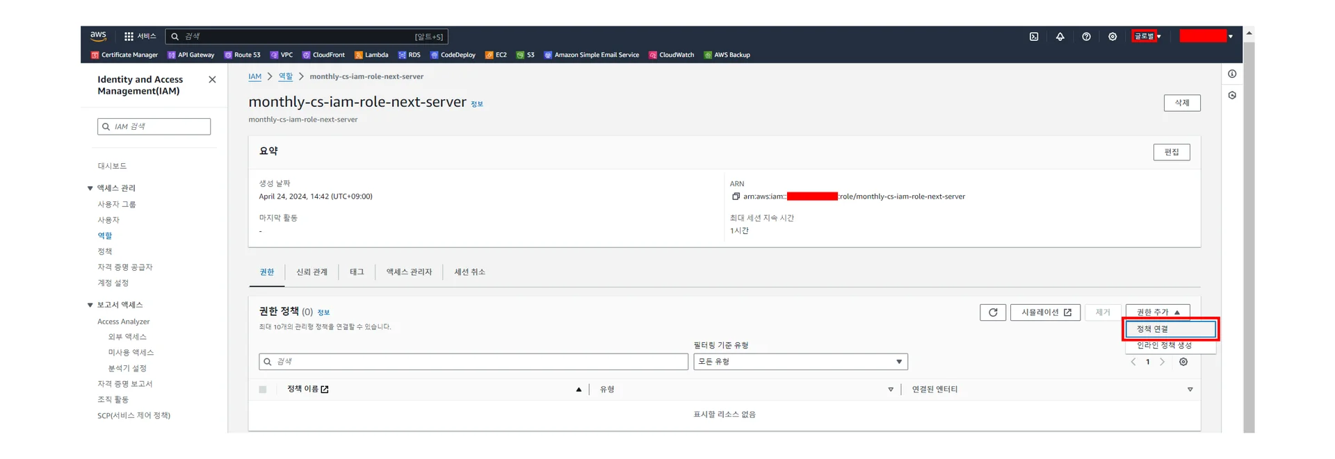 [IAM] - [역할] - [monthly-cs-iam-role-next-server] 우하단 하얀색 [권한 추가] - [정책 연결]을 클릭하기