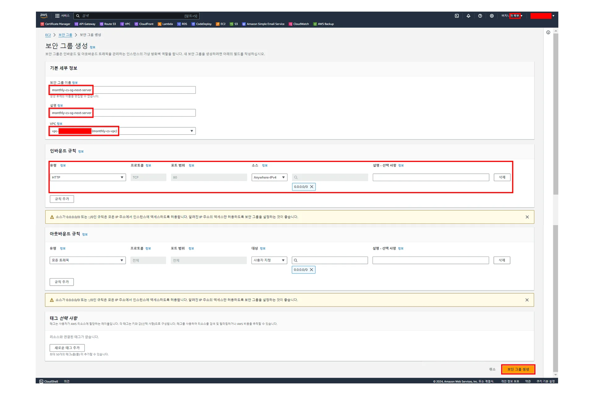 [EC2] - [보안 그룹] - [보안 그룹 생성]에서 주요 설정값을 아래 이미지를 참고하여 수정하고 우하단 주황색의 [보안 그룹 생성] 클릭하기