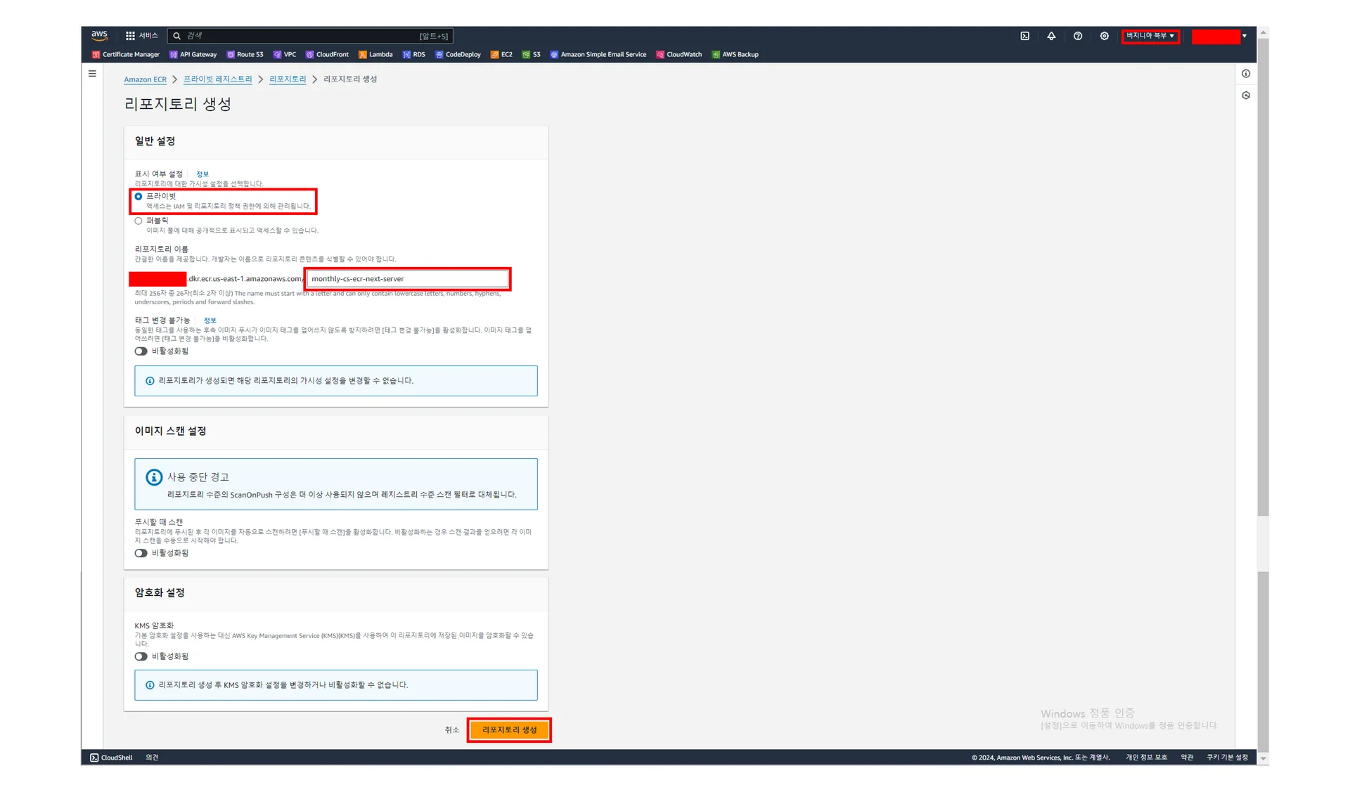 [Amazon ECR] - [프라이빗 레지스트리] - [리포지토리] - [리포지토리 생성]에서 주요 설정값들을 아래 미리 보기 이미지를 참고하여 생성하기
