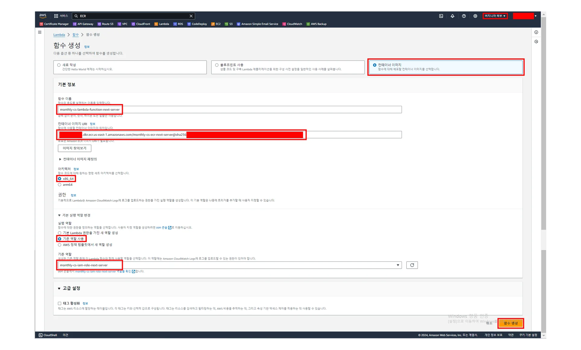 [Lambda] - [함수] - [함수 생성]에서 주요 설정값을 아래 미리 보기 이미지를 참고하여 수정하여 [함수 생성] 클릭하기