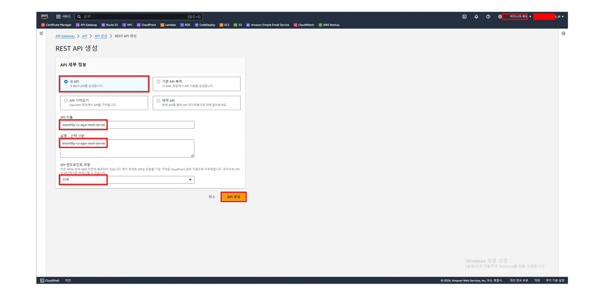 [API Gateway] - [API] - [API 생성] - [REST API 생성]에서 주요 설정값을 아래 미리 보기 이미지를 참고하여 설정하고 나서 API 생성 클릭하기