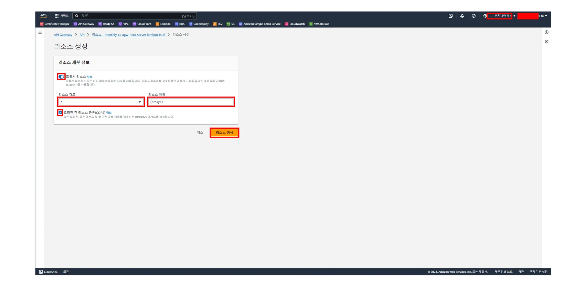 [API Gateway] - [API] - [리소스 - monthly-cs-agw-next-server (고유키)] - [리소스 생성]에서 주요 설정값을 아래 미리 보기 이미지를 참고하여 설정하고 나서 리소스 생성 클릭하기