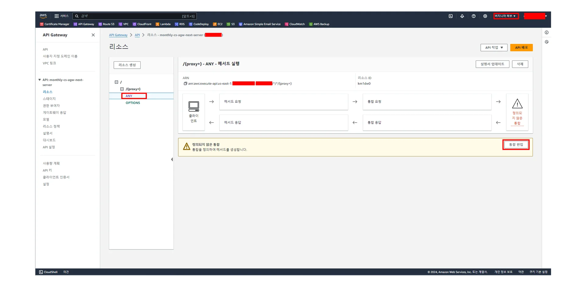 [API Gateway] - [API] - [리소스 - monthly-cs-agw-next-server (고유키)]에 있는 [/] - [/{proxy+}] - [ANY]를 클릭하면 보이는 정의되지 않은 통합이라는 경고창의 맨우측의 [통합 편집]을 클릭하기