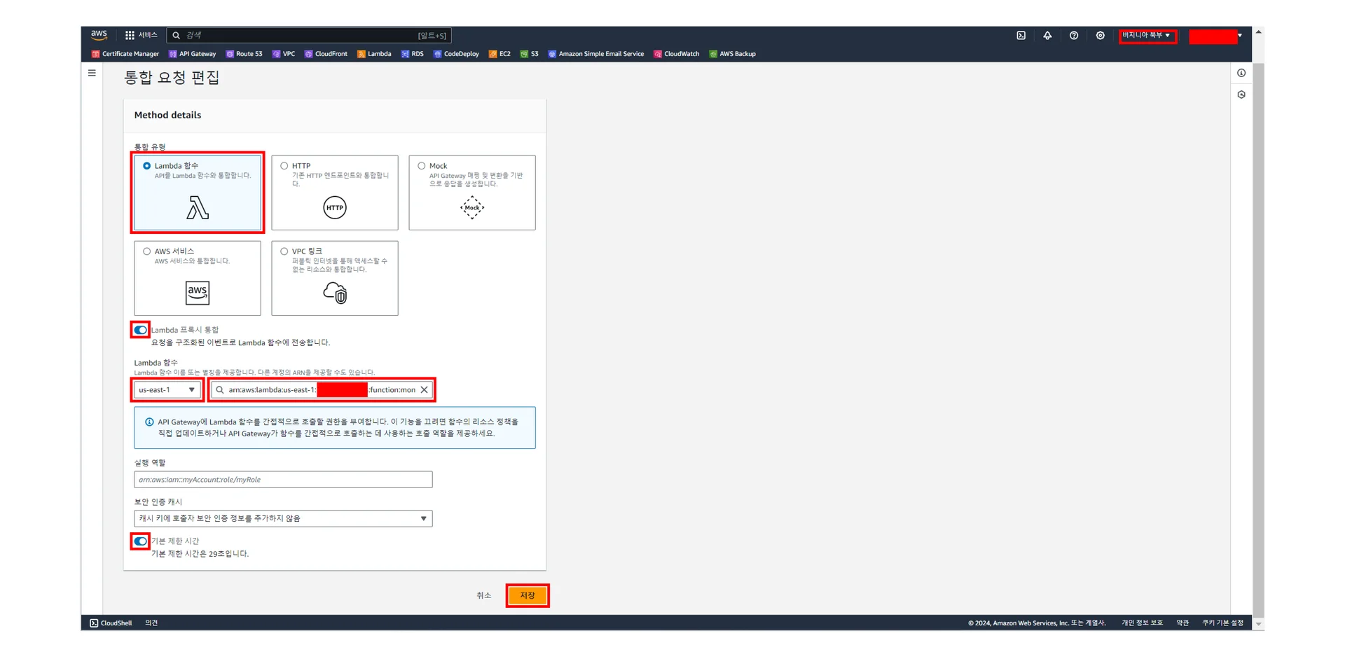 [API Gateway] - [API] - [리소스 - monthly-cs-agw-next-server (고유키)] - [통합 요청 편집]에서 주요 설정값을 아래 미리 보기 이미지을 참고하여 설정하고 우하단 주황색의 [저장] 클릭하기