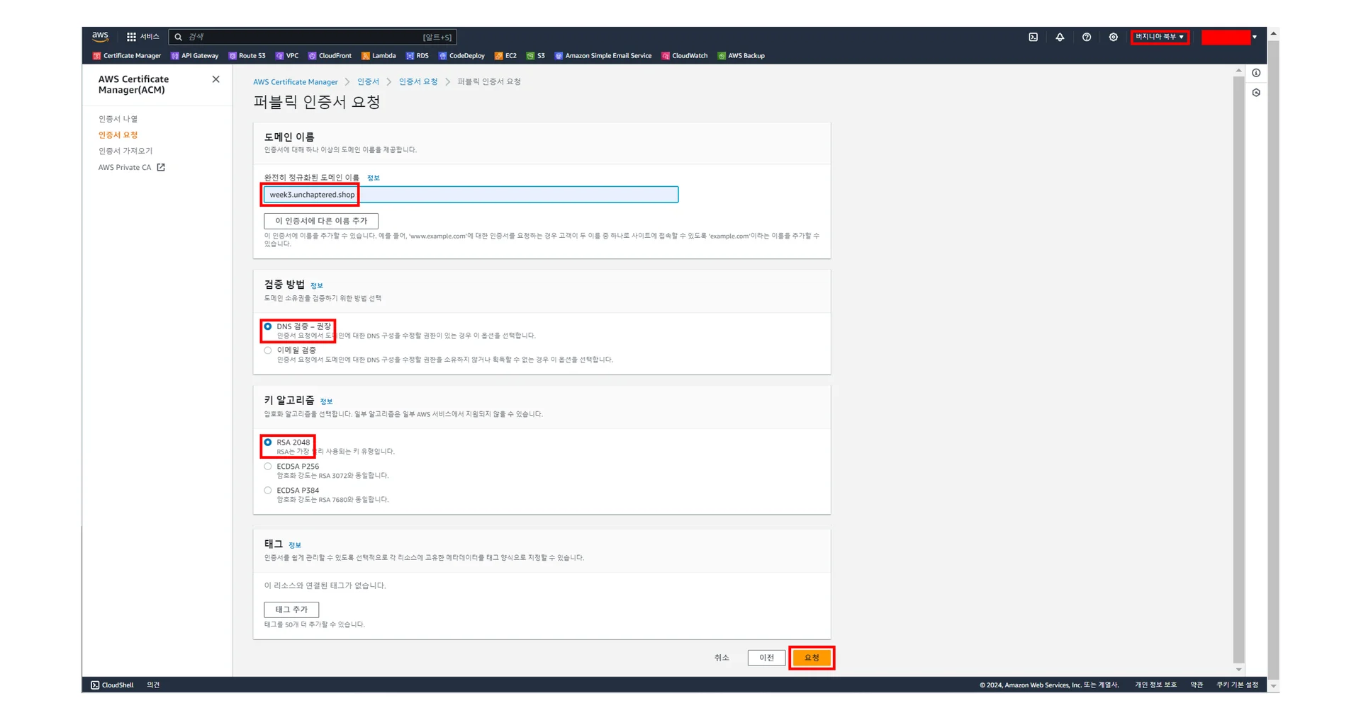 week3.<구매한 도메인>에 맞는 ACM을 생성하고 이를 Route53에 등록할 것입니다.
