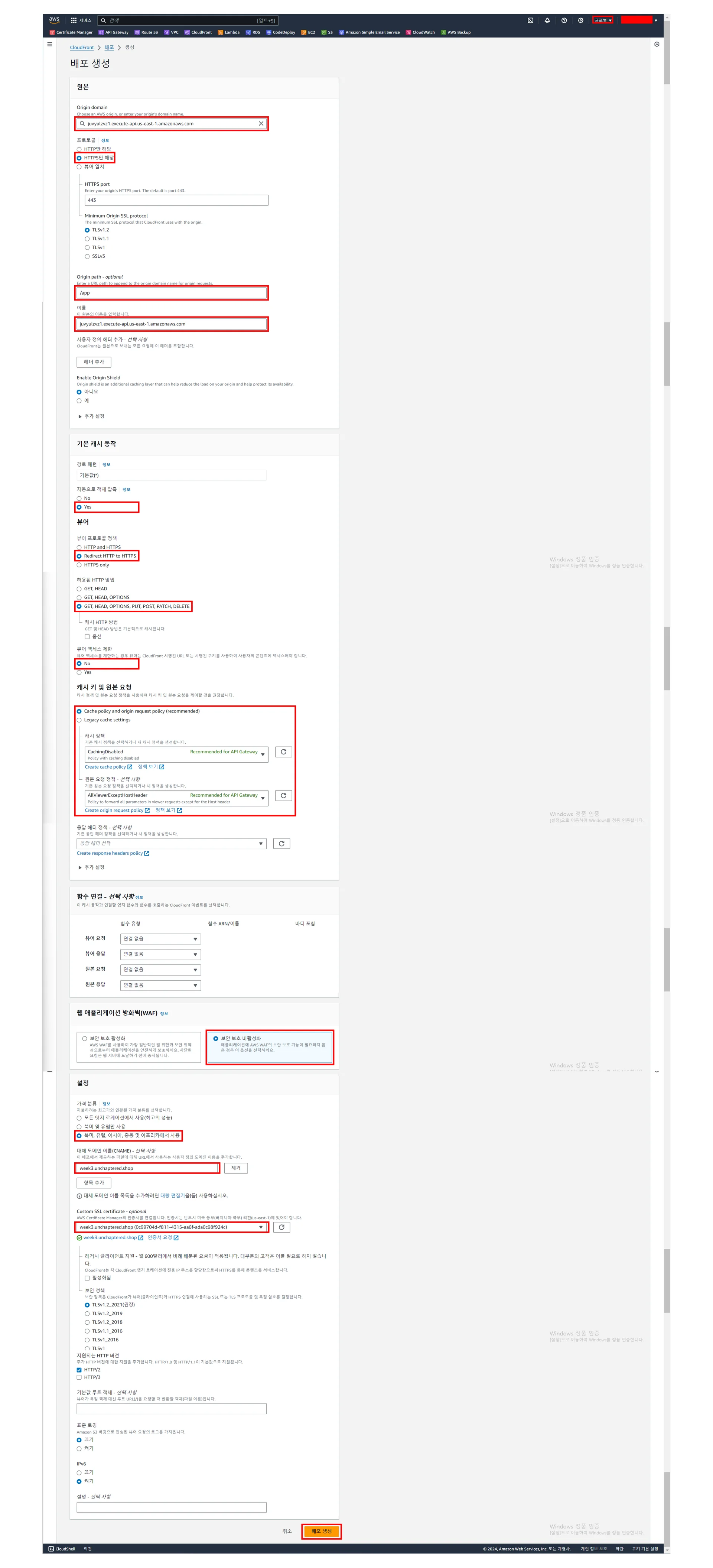 [CloudFront] - [배포] - [생성]에서 주요 설정값을 다음 미리 보기 이미지를 참고하여 설정 후, 우하단 주황색의 [배포 생성] 클릭하기