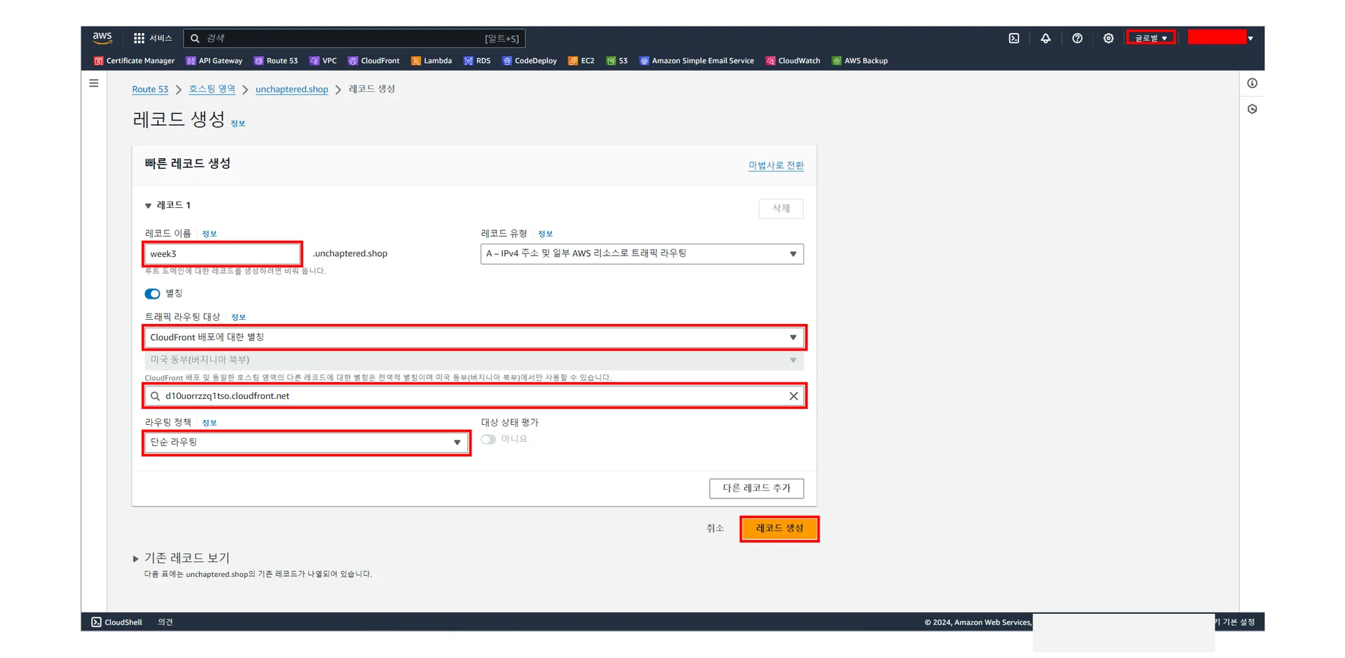 [Route53] - [호스팅 영역] - [<도메인 명>] - [레코드 생성]에서 주요 설정값을 다음 미리 보기 이미지를 참고하여 설정 후 우하단 주황색의 레코드 생성 클릭하기