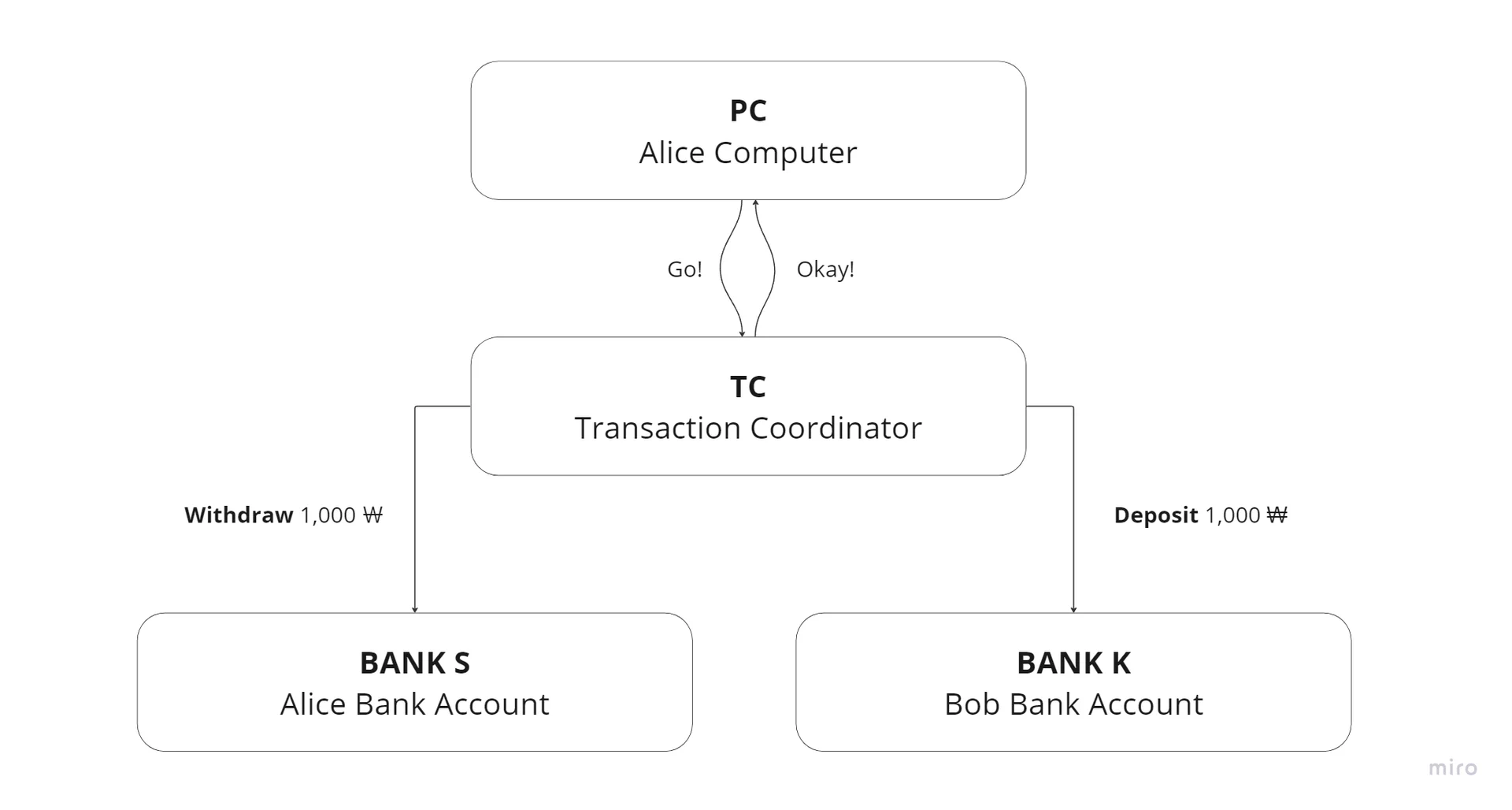 트랜잭션 코디네티어(TC)가 거래 당사자 은행 S와 K에게 각각 Alice, Bob 계좌 잔금의 변동을 요청한다.
