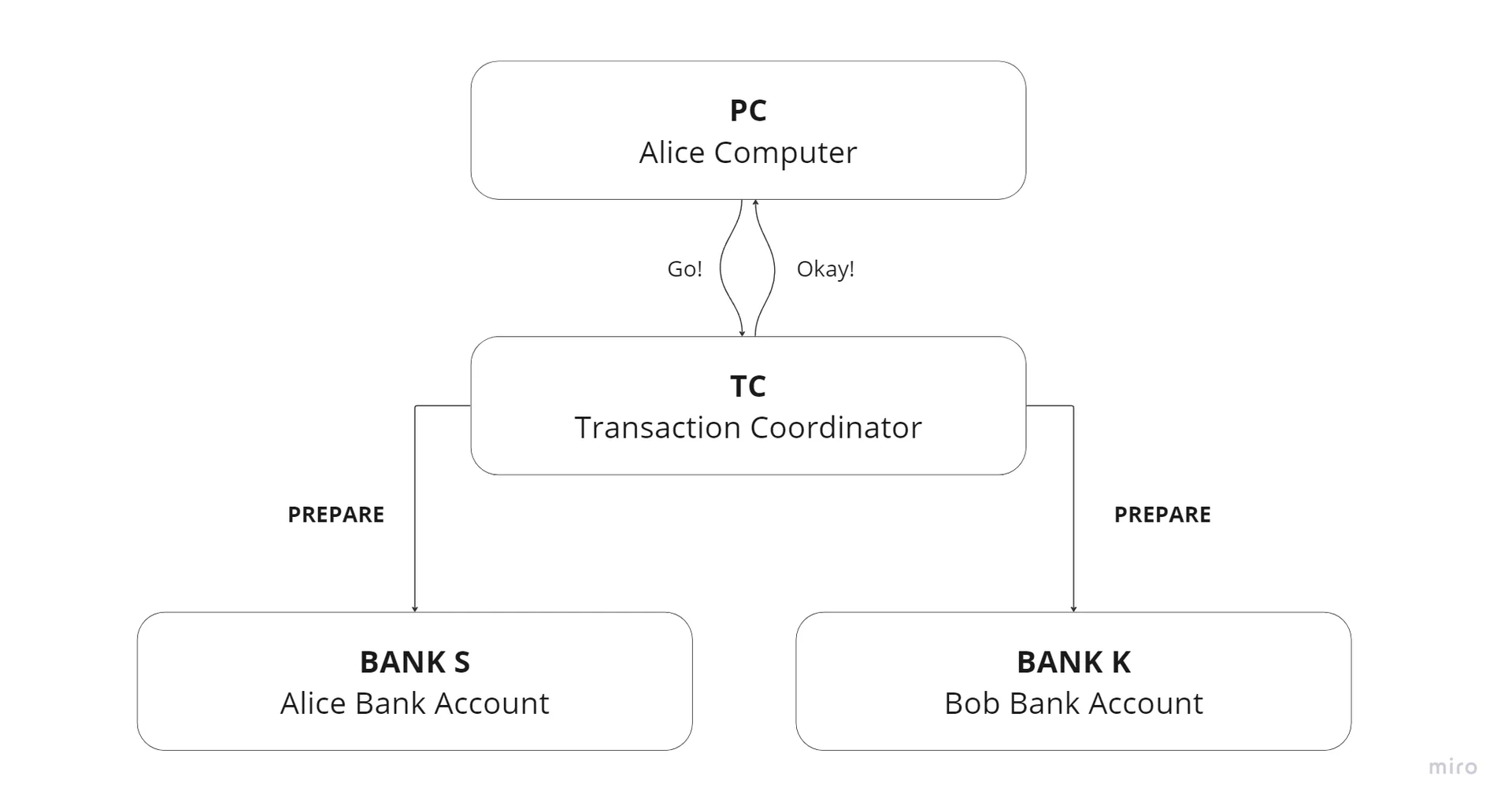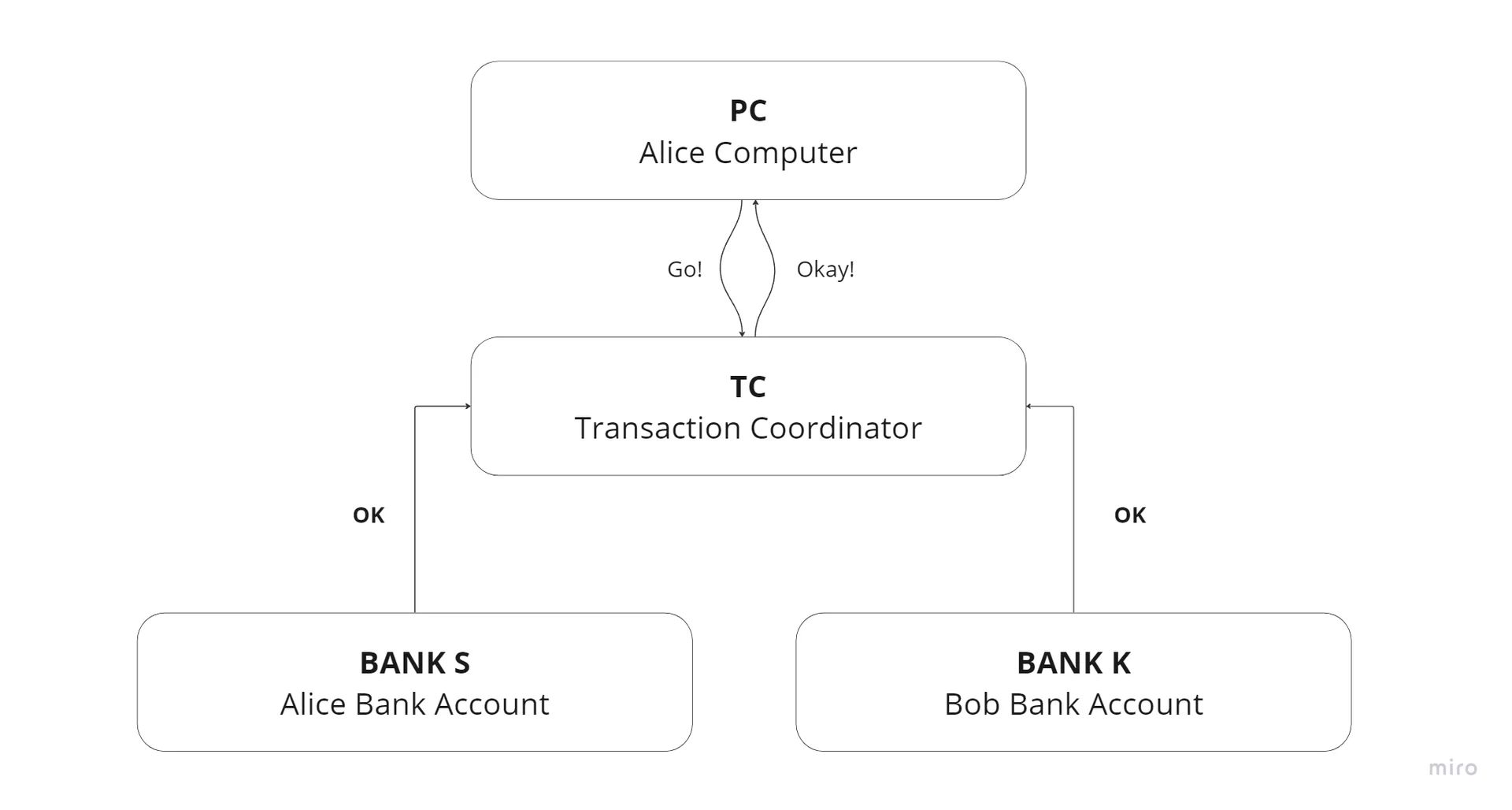 Alice 컴퓨터는 트랜잭션 코디네이터(TC)를 통해 요청을 보낸다.