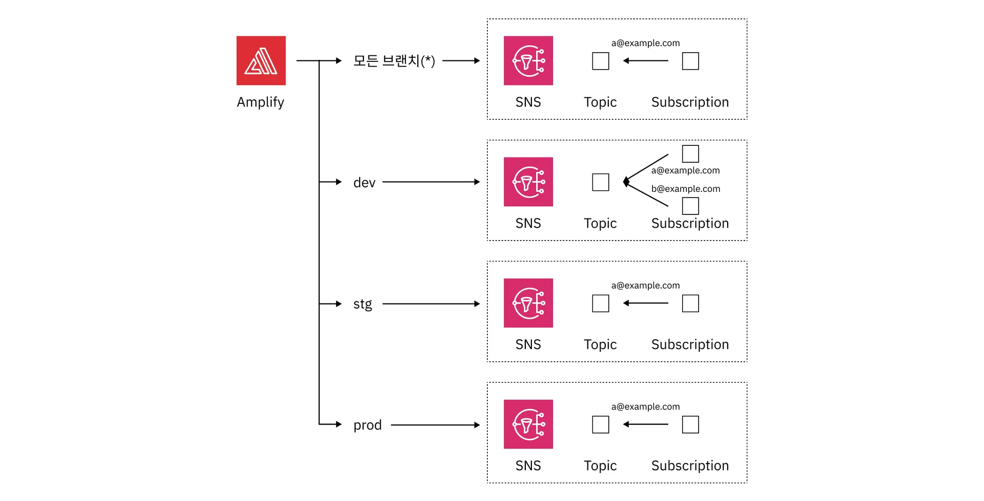 Amplify 빌드 알림에서는 브랜치 및 전송 대상을 설정할 수 있습니다.