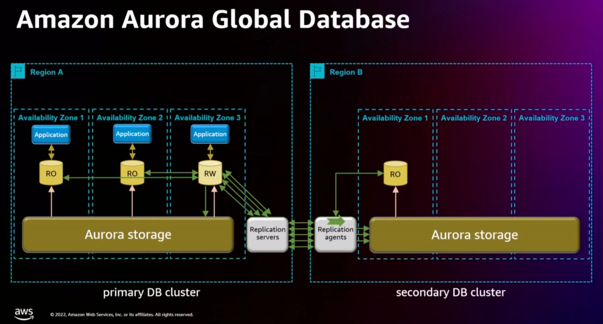 Primary DB Cluster의 Primary Instance에 삽입된 데이터는 Primary Cluster Volume에서 일정 주기로 Replication agents*를 통해서 Secondary Cluster Volume으로 복제됩니다.