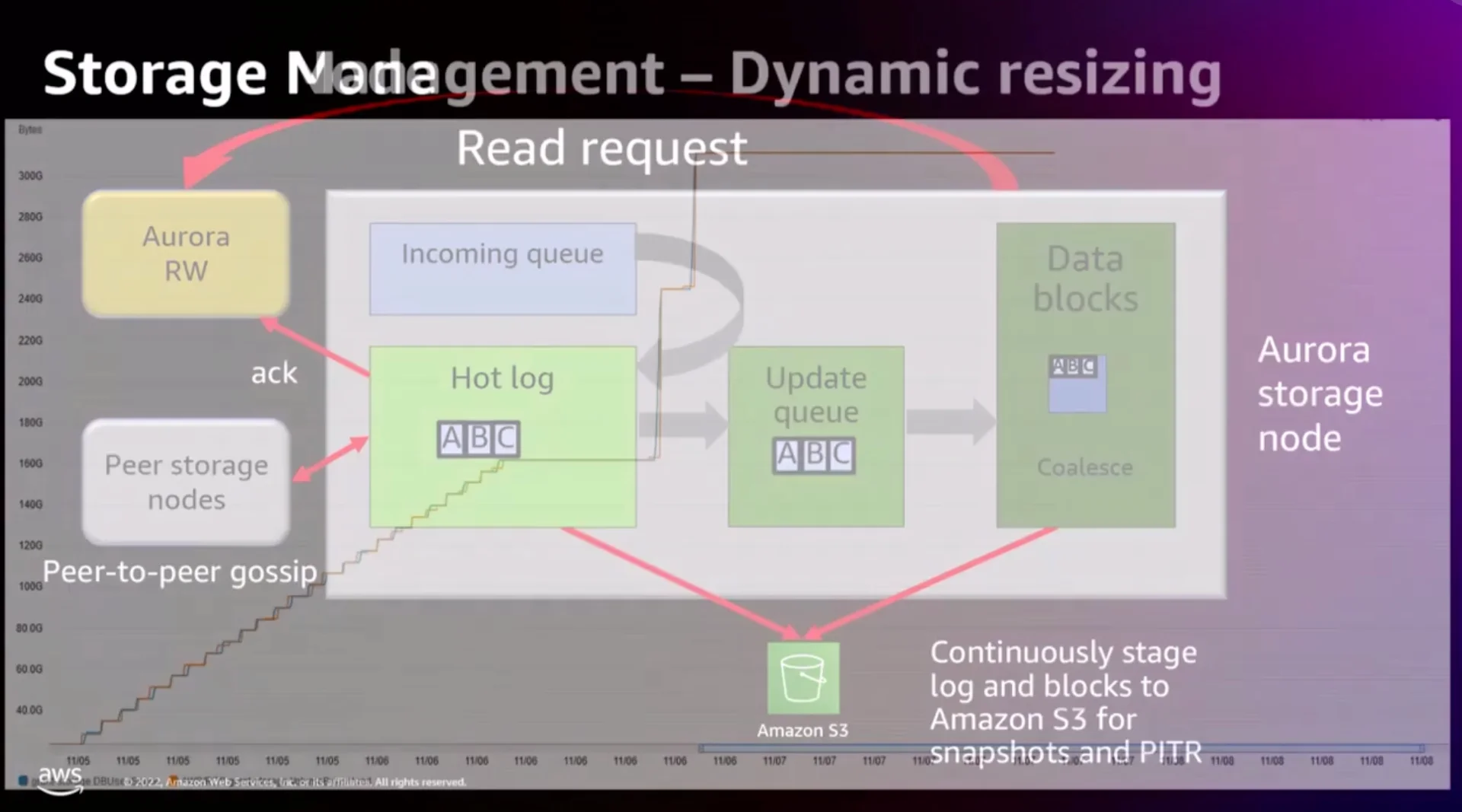 하지만 Aurora PostgreSQL에서는 블록(Block) 단위로 체크포인트(Checkpoint)를 제어하지 않습니다. 오직 업데이트 쿼리에 대한 백업 작업이 이루어지며 밀리초(ms) 단위의 지연시간이 발생합니다.