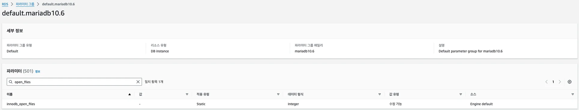 AWS RDS에서 MariaDB에서는 innodb_open_files라는 값을 가집니다.