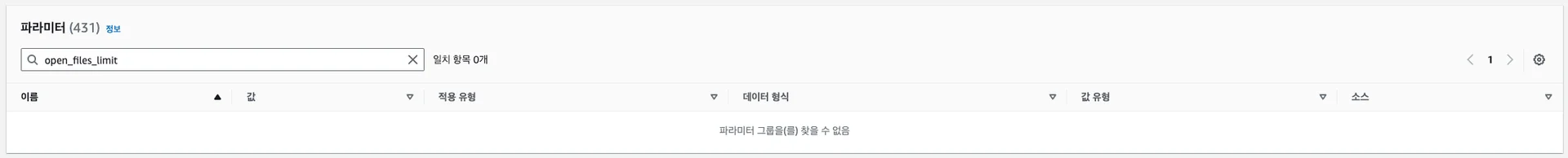 SELECT @@oepn_files_limit다른 설정값들은 Amazon RDS Parameter Group에서 볼 수 있는 것과는 달리