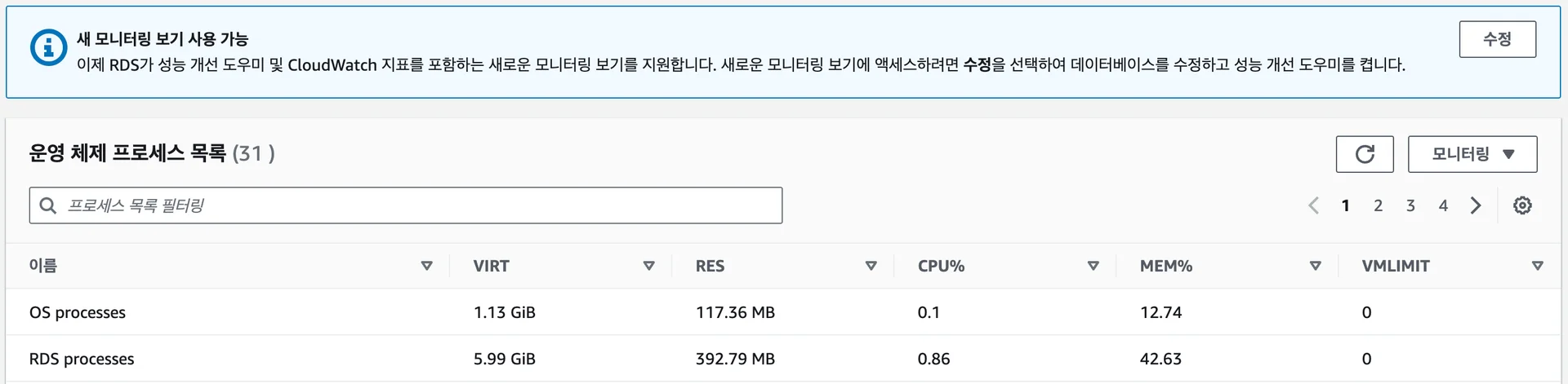 즉 db.t3.micro의 1 GB는 1 GiB가 아니며 RDS에서 향상된 모니터링*으로 확인하면, 943.5 MB의 용량을 가진 것을 알 수 있습니다.