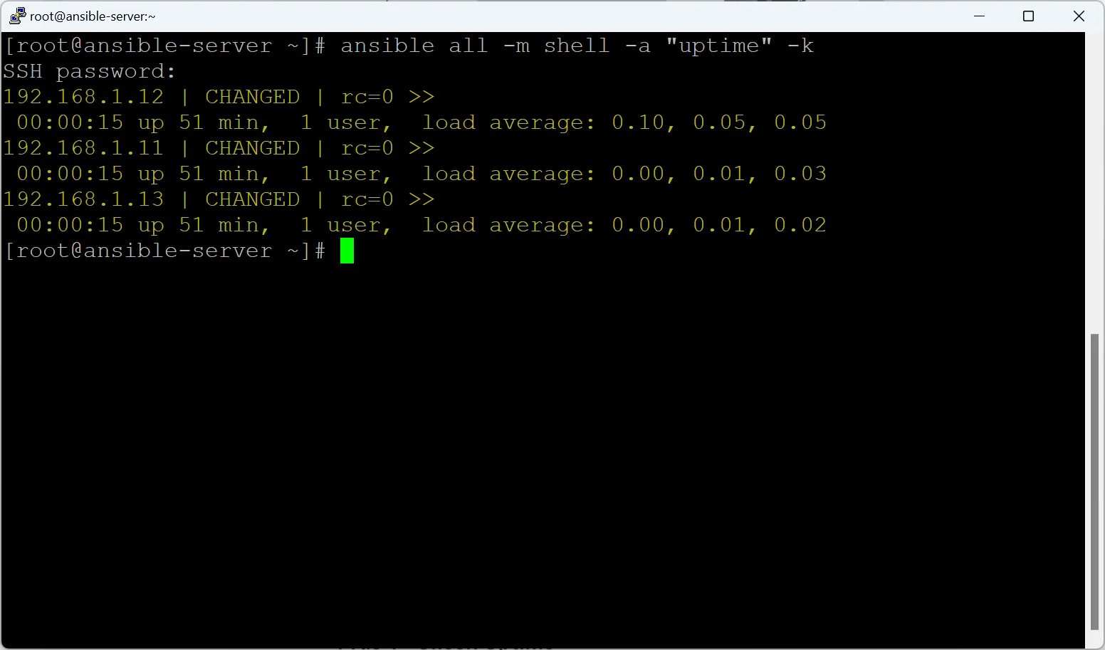 ansible all -m shell -a "uptime" -k