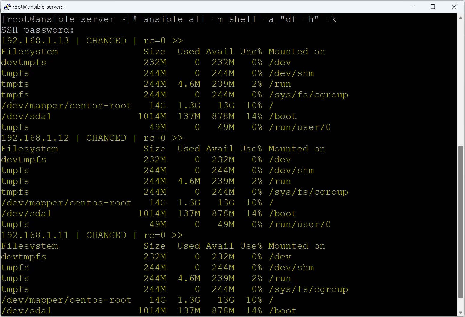 ansible all -m shell -a "df -h" -k
