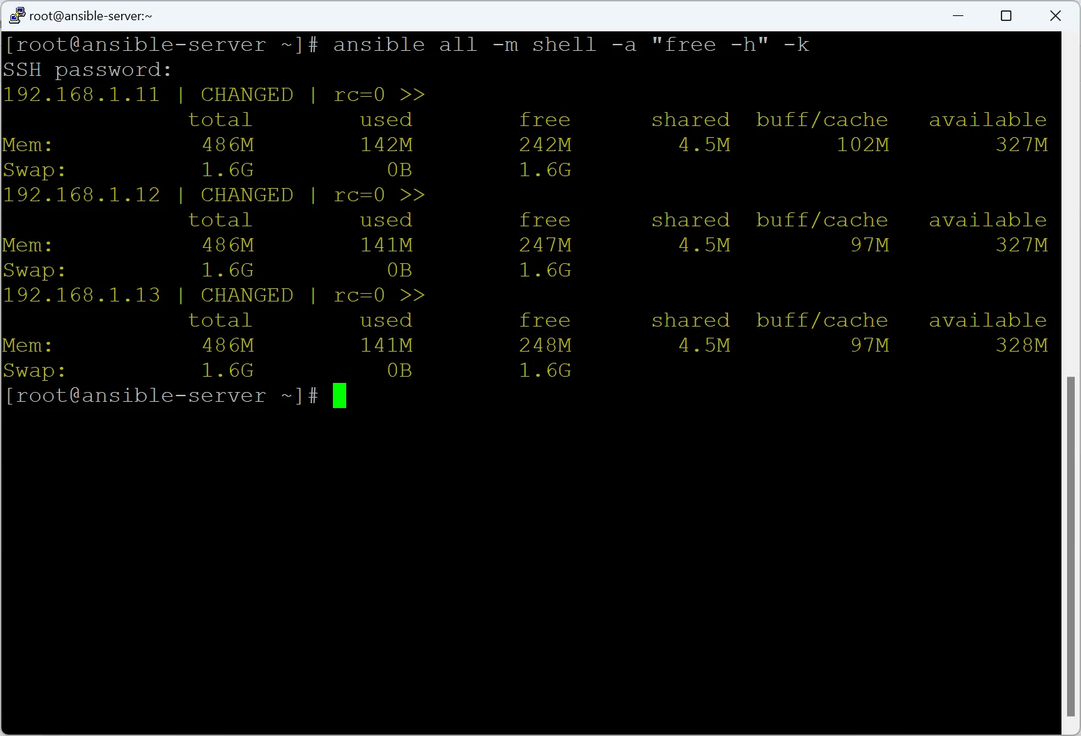 ansible all -m shell -a "free -h" -k