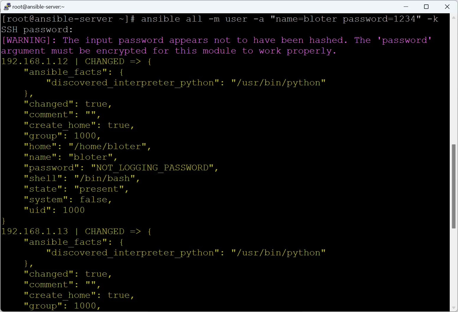 ansible all -m user -a "name=bloter password=1234" -k