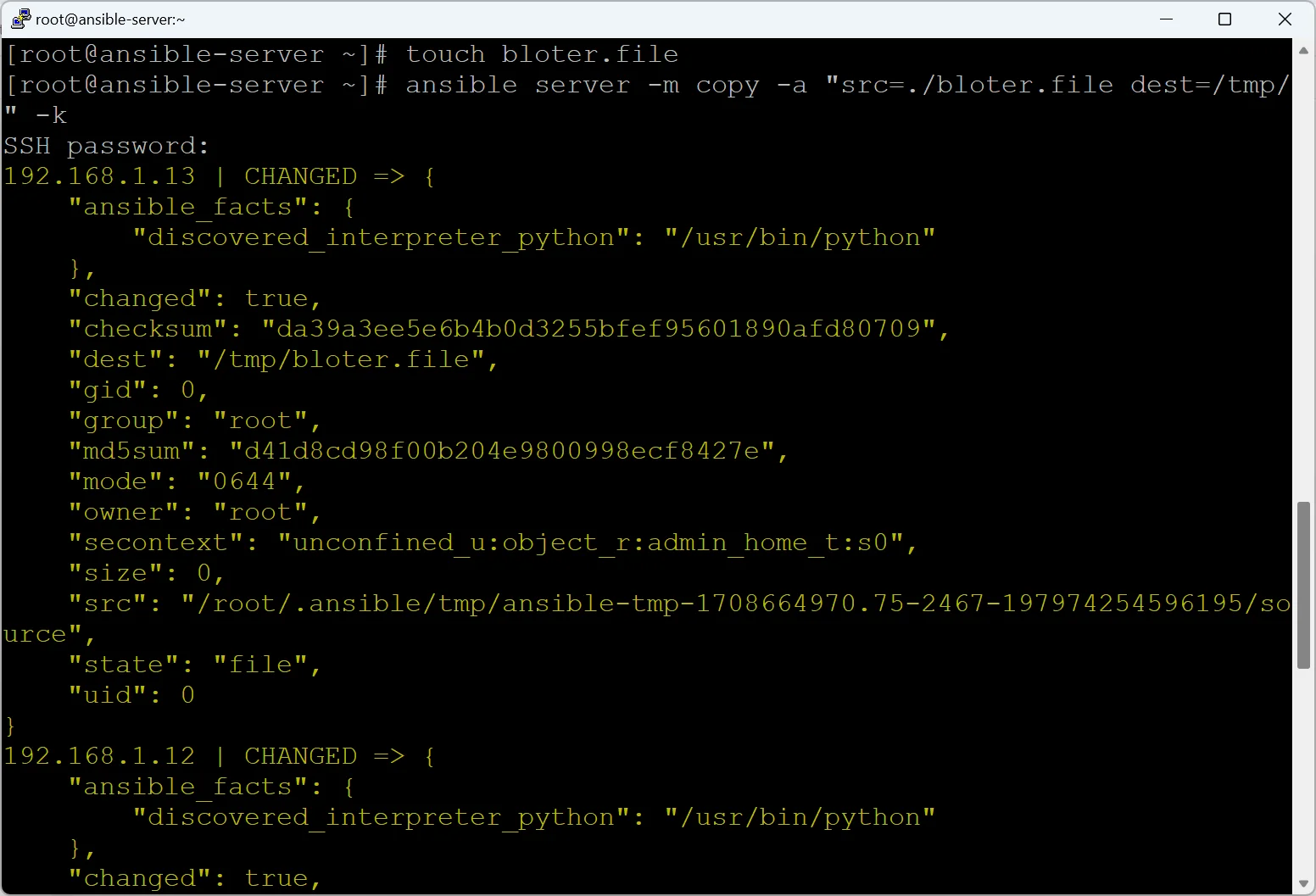 ansible server -m copy -a "src=./bloter.file dest=/tmp/" -k