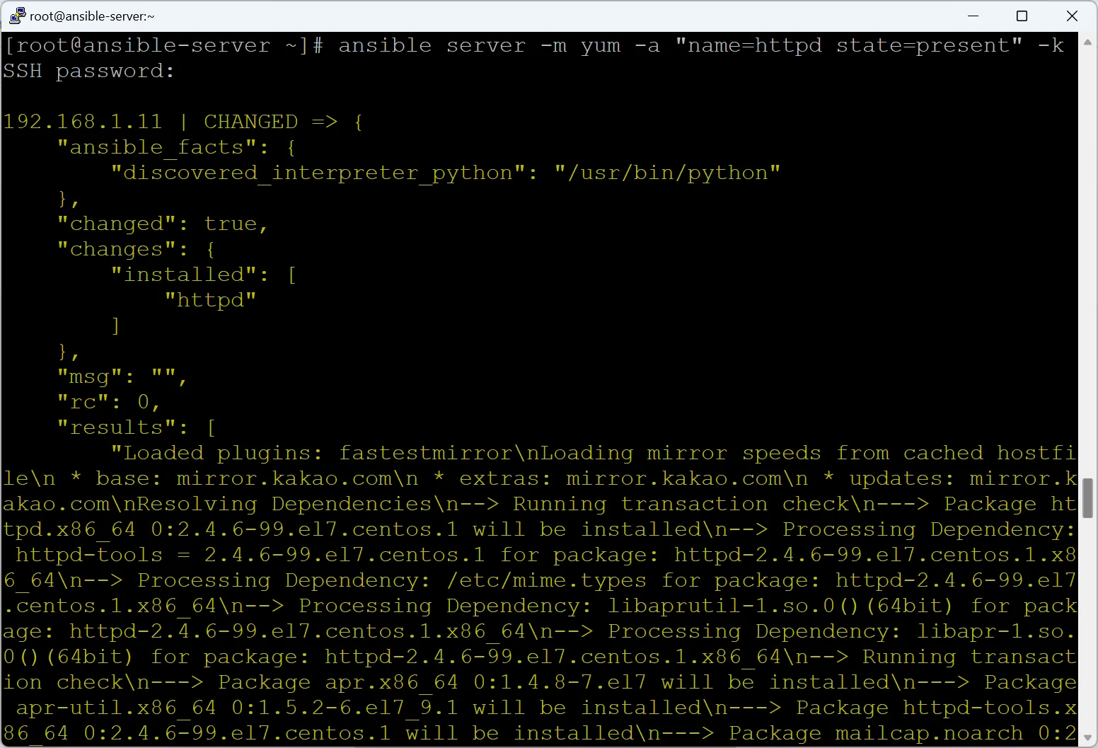 ansible server -m yum -a "name=httpd state=present" -k