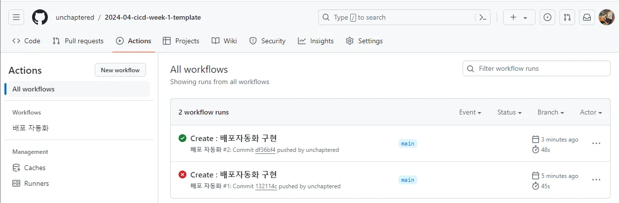 배포 자동화는 Action 탭에서 확인할 수 있습니다.