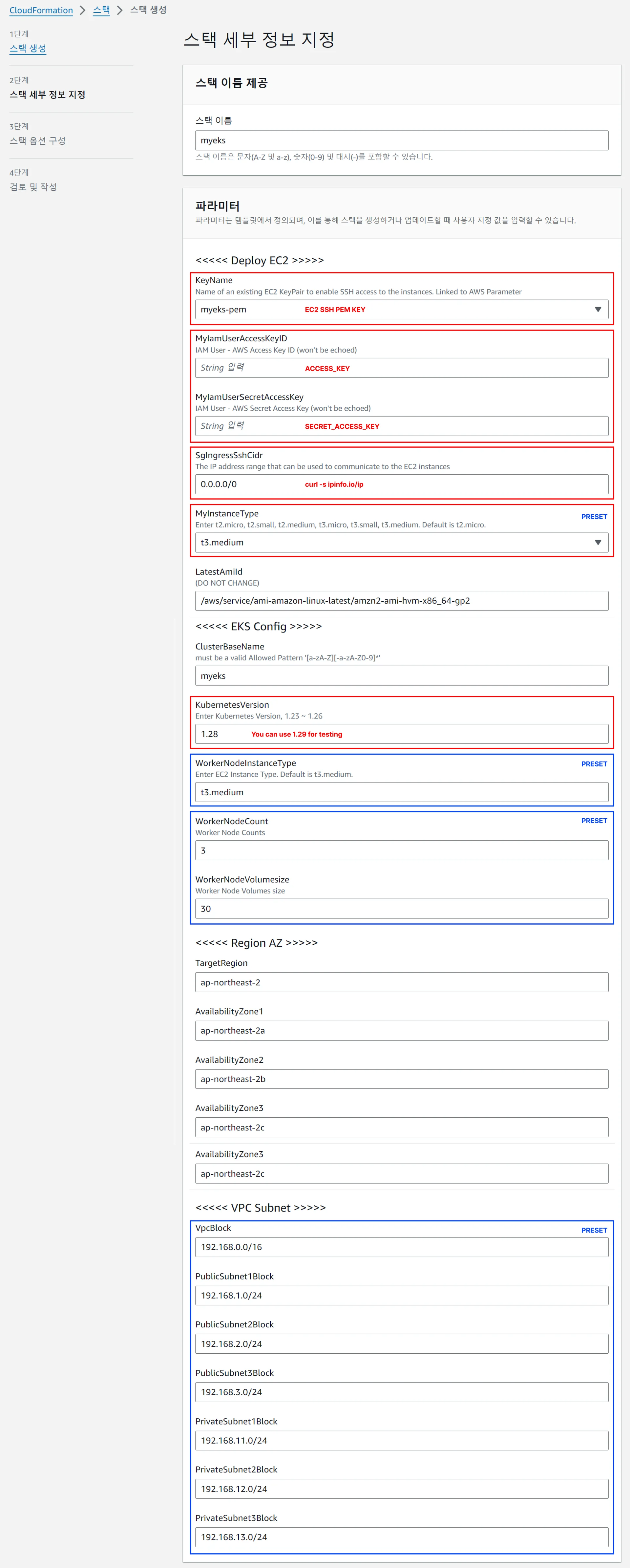 --parameter-overrides KeyName=kp-gasida SgIngressSshCidr=$(curl -s ipinfo.io/ip)/32 MyIamUserAccessKeyID=AKIA5... MyIamUserSecretAccessKey='CVNa2...' ClusterBaseName=myeks \