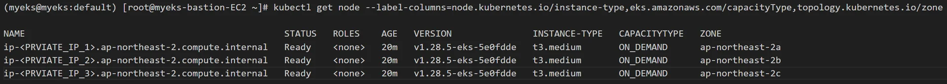 kubectl get node --label-columns=node.kubernetes.io/instance-type,eks.amazonaws.com/capacityType,topology.kubernetes.io/zoneeksctl