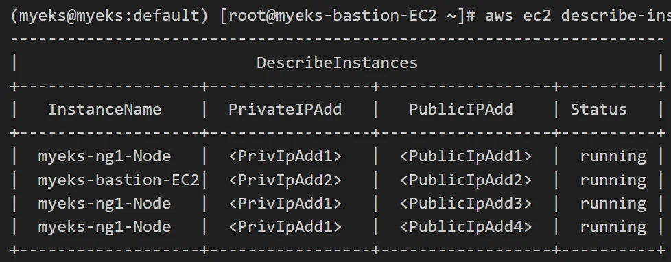 aws ec2 describe-instances --query "Reservations[*].Instances[*].{PublicIPAdd:PublicIpAddress,PrivateIPAdd:PrivateIpAddress,InstanceName:Tags[?Key=='Name']|[0].Value,Status:State.Name}" --filters Name=instance-state-name,Values=running --output tableSet environment of worker nodes in bastion ec2.