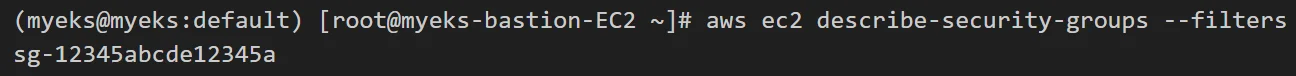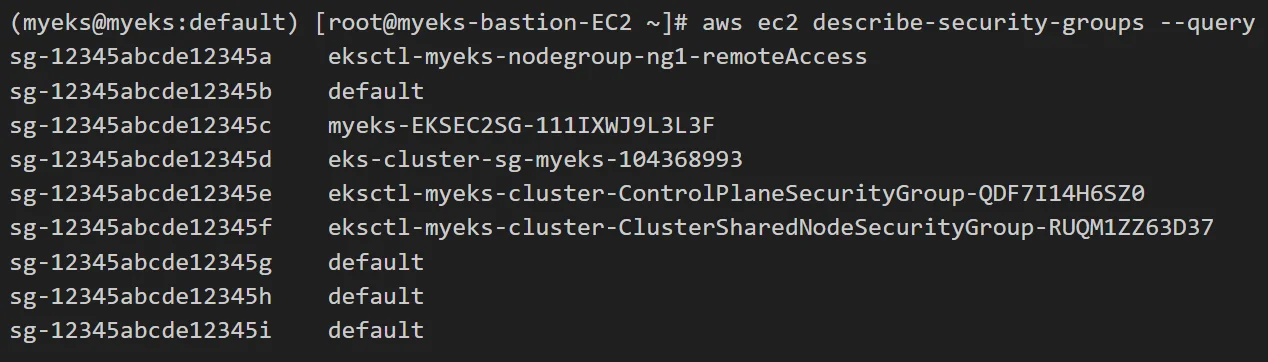 N1=$(kubectl get node --label-columns=topology.kubernetes.io/zone --selector=topology.kubernetes.io/zone=ap-northeast-2a -o jsonpath={.items[0].status.addresses[0].address}) N2=$(kubectl get node --label-columns=topology.kubernetes.io/zone --selector=topology.kubernetes.io/zone=ap-northeast-2b -o jsonpath={.items[0].status.addresses[0].address}) N3=$(kubectl get node --label-columns=topology.kubernetes.io/zone --selector=topology.kubernetes.io/zone=ap-northeast-2c -o jsonpath={.items[0].status.addresses[0].address}) echo "export N1=$N1" >> /etc/profile echo "export N2=$N2" >> /etc/profile echo "export N3=$N3" >> /etc/profile echo $N1, $N2, $N3Check Security Id and Security Group