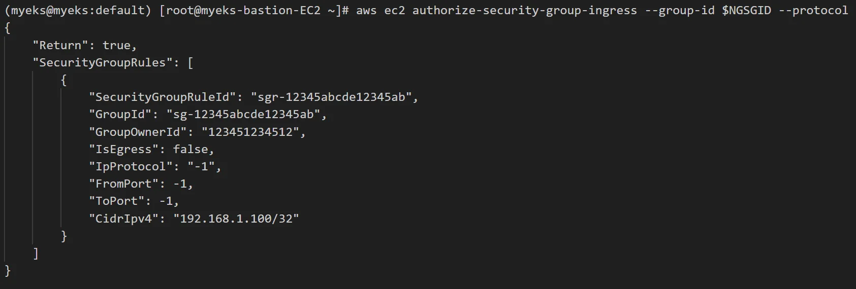 aws ec2 authorize-security-group-ingress --group-id $NGSGID --protocol '-1' --cidr 192.168.1.100/32Check accessbility to worker node from bastion ec2.